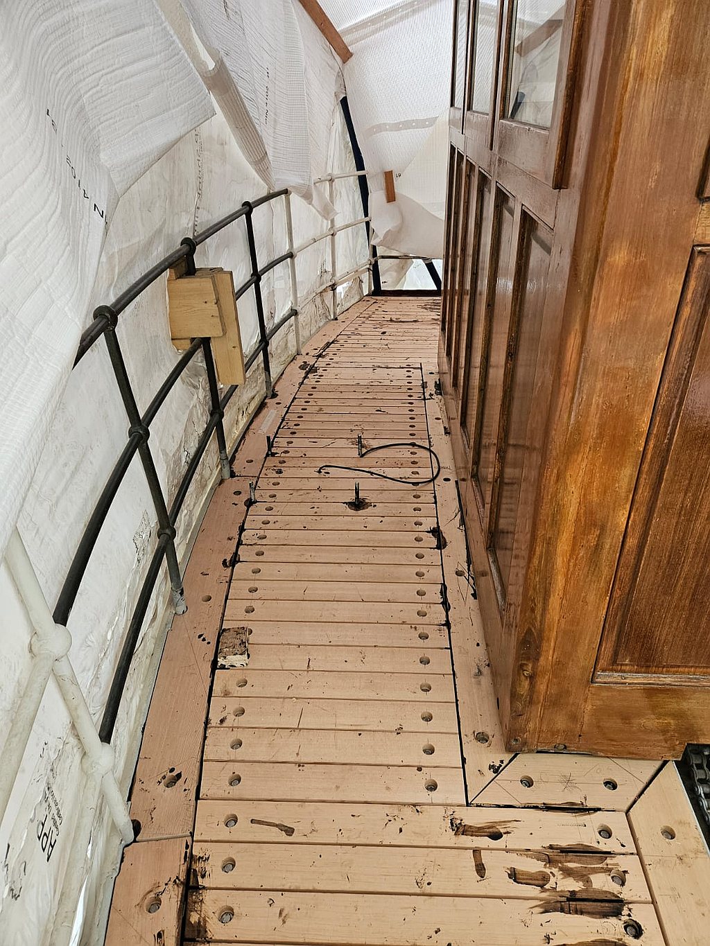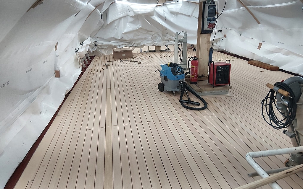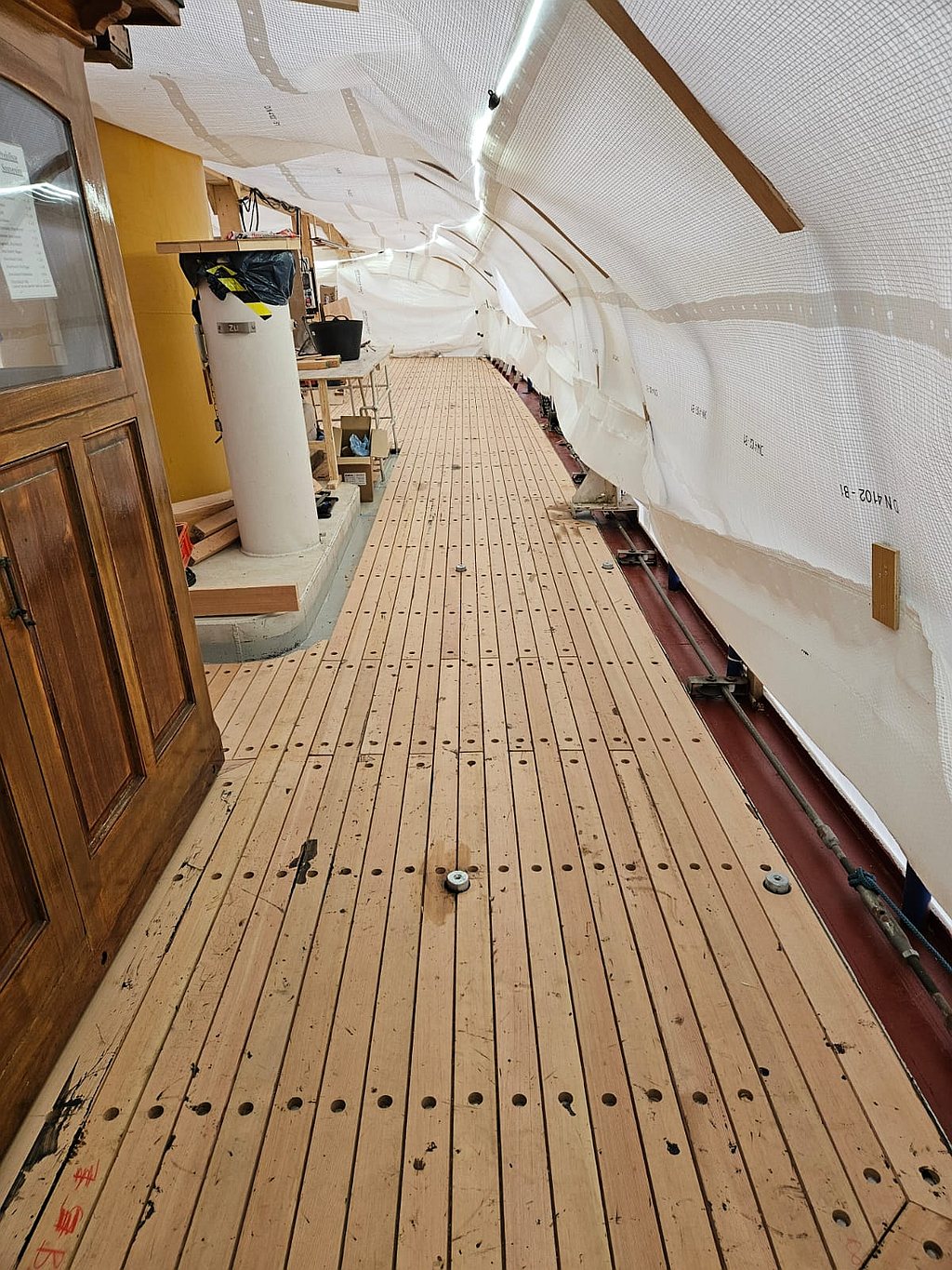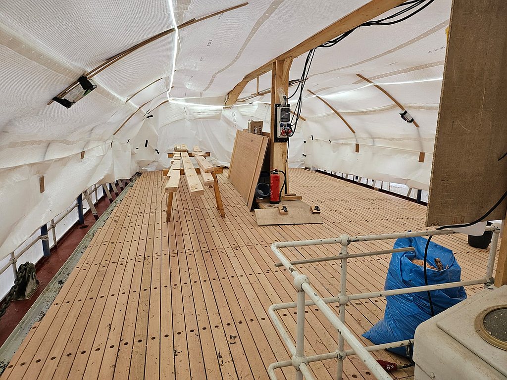Was passiert da drinnen? So fragt wohl, wer die >Prinz Heinrich< an ungewohntem Liegeplatz am Gelände der Reederei Buss entdeckt – es sind überwiegend im Hafen Tätige. Stadtbummler vermissen den Dampfer an seinem gewohnten Platz in der Altstadt und rätseln, wo das Schmuckstück wohl geblieben sein mag. Die Antwort: Die >Prinz Heinrich< liegt im Hafen und die Decksbeplankung wird erneuert. Das ist nötig, weil die alte marode war.