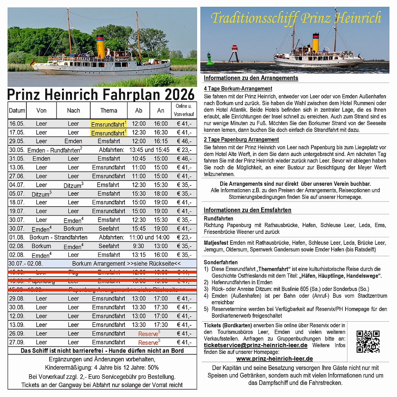 Verein und Mannschaft der "Prinz Heinrich" haben mit dem neuen Fahrplan die Saison 2026 eröffnet. Es gibt wieder zahlreiche Rundfahrten auf der Ems und die Fahrten zum Emder Matjesfest mit Hafenrundfahrten sowie nach Borkum mit den begehrten Strandfahrten und Richtung Papenburg sind Teil des diesjahrigen Fahrplans. Lassen Sie sich auf der "Prinz Heinrich" in die Kaiserzeit versetzen und geniessen Sie ein paar Stunden auf diesem letzten Zeitzeugen der damaligen Bäder- und Postschiffe.